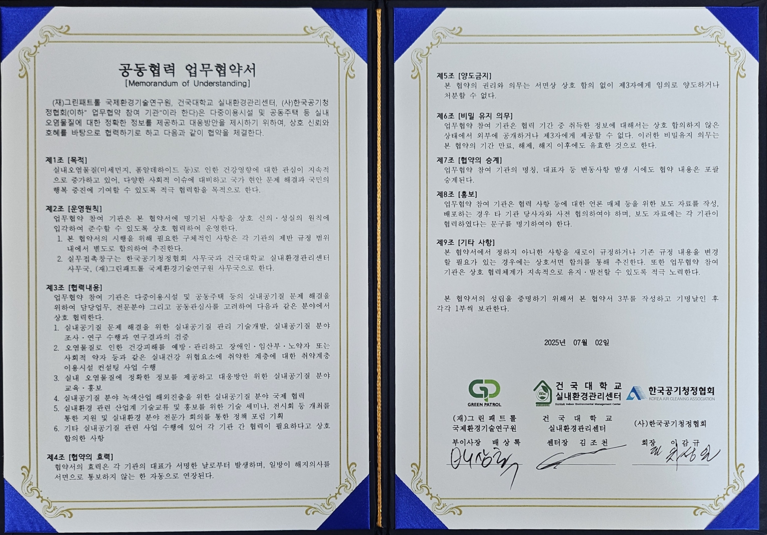 건국대학교 실내환경관리센터(KIEMC), (재)그린패트롤국제환경기술연구원(GPTF), 한국공기청정협회(KACA)는 미세먼지, 폼알데하이드 등 실내오염물질로 인한 건강영향에 대한 관심이 지속적으로 증가하고 있어, 다양한 사회적 이슈에 대비하고 국가 현안 문제 해결과 국민의 행복 증진에 공동으로 기여하기 위한 업무협약(MOU)를 체결하였다.